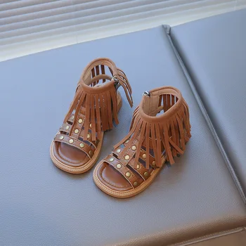 Women's Middle School Children's Tassel Open-toed Roman Sandals 2025 Summer New Children's Soft Sole Bohemian Sandals